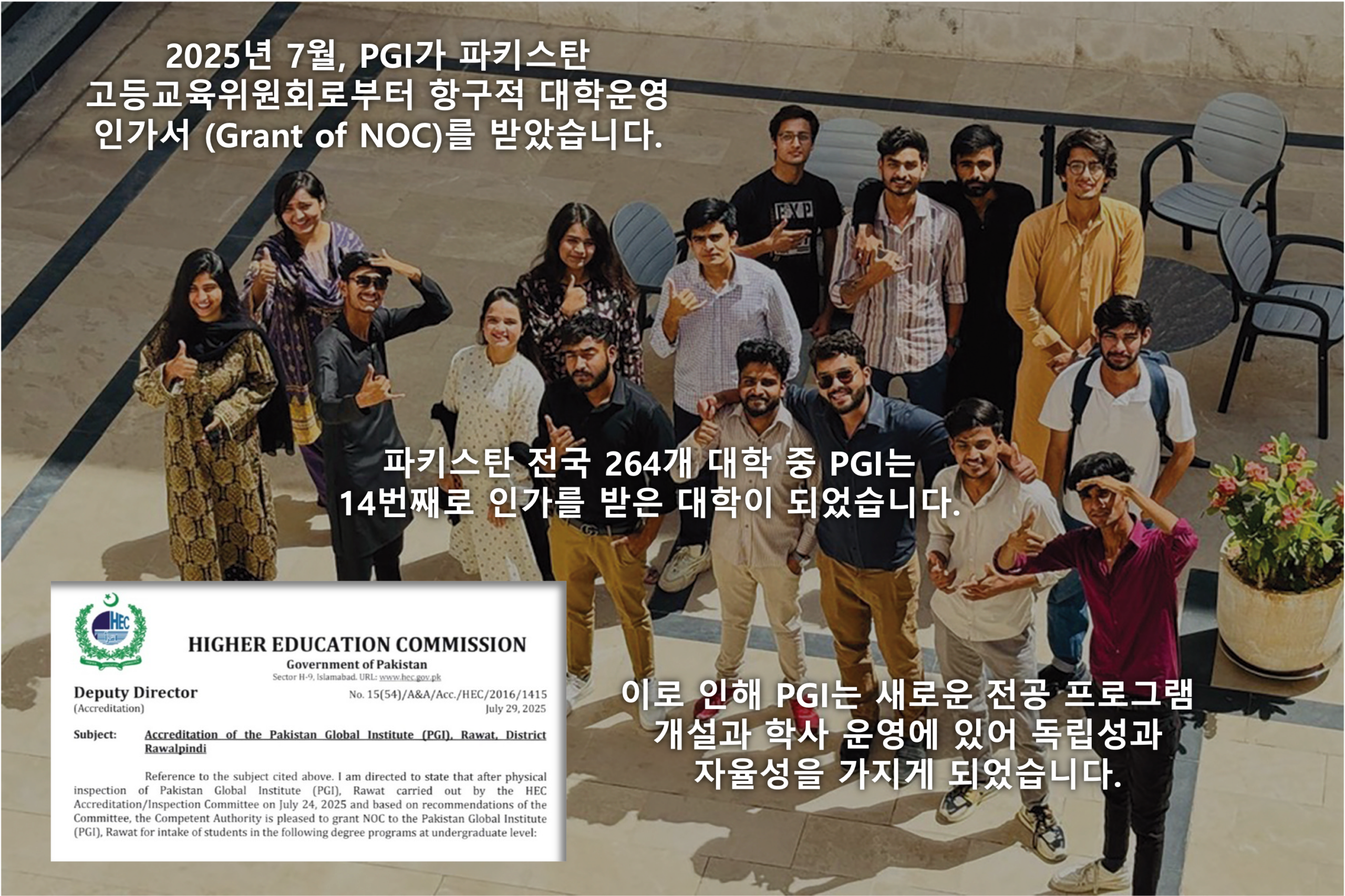 파키스탄 최초의 한국 대학교 중동 지도자를 길러내며 지속 가능한 변화를 만듭니다 후원하기 스토리 파키스탄 국제대학교와 한-서아시아 교육 연대의 이야기를 전해드립니다. PGI 대학에서의 나의 경험신입생이 입학 전에 이수하는 파운데이션 코스, 아닐라 학생이 자신의 경험을 나눕니다. 파키스탄 국제대학교의 비전과 여정김경언 총장이 PGI의 비전을 전합니다. 내가 생각하는 PGIPGI에 근무하는 파키스탄인 직원들이 PGI 에 대해 어떤 생각을 가지고 있는지 들어보았습니다.